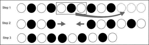 - Las tres piezas se deben mover hasta el final de la fila (aunque no importa cual)