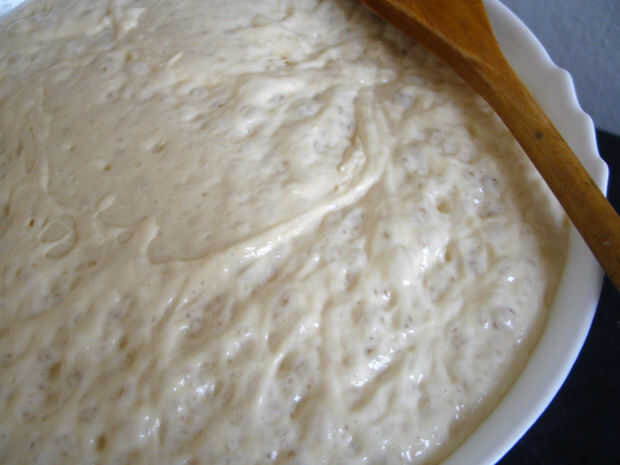 Ahora use algo para revolver vigorosamente o batidor, la mezcla juntos. Haga esto durante 5-10 minutos hasta que la mezcla es una masa goopy, casi como lo que se usaría para panqueques pero mucho más grueso. Me gusta usar el extremo de mango de una cuchara de madera mezclar mi chapata masa porque es fácil de mover la masa alrededor y también porque es fácil de limpiar.