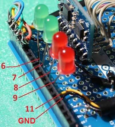 Por lo tanto, la + ve redonda de lado de los 4 LED que vemos aquí está conectadas a los pines digitales 6,7,8 y 9 de la Protoshield. Yo les soldadas en los agujeros justo al lado de los orificios respectivos socket negro el Protoshield.