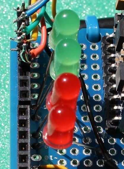 Aquí es otro punto de vista de los LED y el cómo se sueldan en, además de los 2 cables de comunicación serial del cable a la Sabertooth.