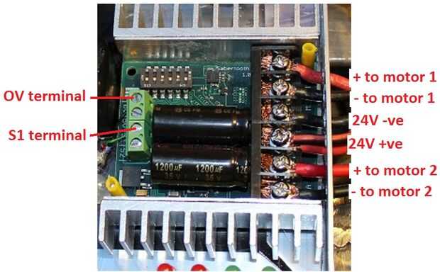 En esta imagen del Sabertooth 2 x 25 Amp potencia controlador, también he demostrado las conexiones a la batería de 24V principal y también las conexiones a cada uno de los motores.