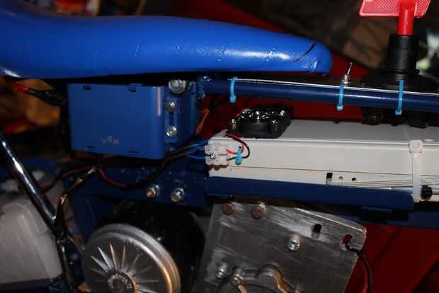 Bajo el asiento se puede ver una caja azul que contiene 6 pilas AA para alimentar el Arduino. Este que se muestra es una buena calidad de una tienda de robot que tiene una tapa que no puede fácilmente ser derribada accidentalmente.