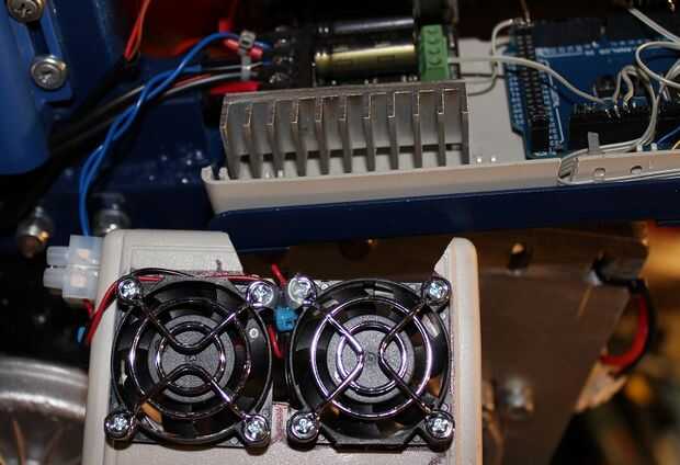 Compré 2 de la computadora más pequeña de 12V ventiladores que pude encontrar. Entonces les conectados en serie entre los dos contactos de energía central de Sabertooth, donde los conductores de alimentación de la batería también están conectados en.