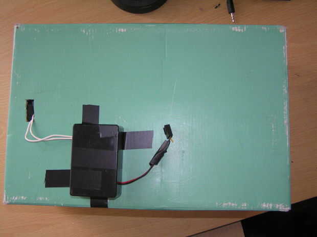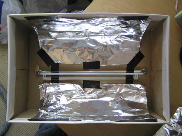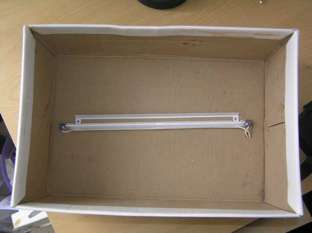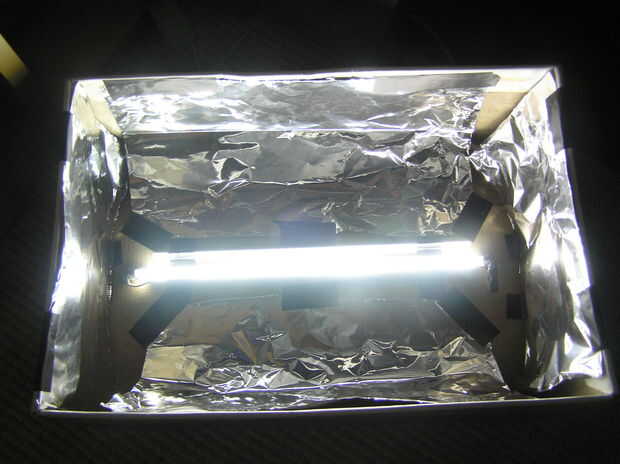 Podría dejarlo como esta, sin embargo me preocupaba no tener potencia suficiente así forrado la caja de zapatos con papel de cocina ligeramente curvada para ayudar a reflejar la luz en la caja de luz. Recuerda que trabajo de CCFLs alto voltaje así que asegúrese de mantener la lámina lejos de los cables de la luz.