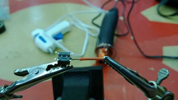 Tome nota que, como el LED, sólo dos dientes en el asunto del interruptor. (En la foto, las dos inferiores los y dos los de arriba están conectados, así que necesitarás los cables para ir de uno en la parte inferior a una en la parte superior.) Conecte un cable del LED a la otra punta.