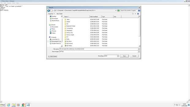 ADVERTENCIA: NO SOY RESPONSABLE DE CUALQUIER DAÑO A SU PC! ESTE ARCHIVO POR LOTES SÓLO DEBE SER UTILIZADO COMO UNA BROMA.Hola.Se trata de un archivo por lotes auto-replicantes que da la apariencia de borrar System32. No quiero perder tiempo hablando,