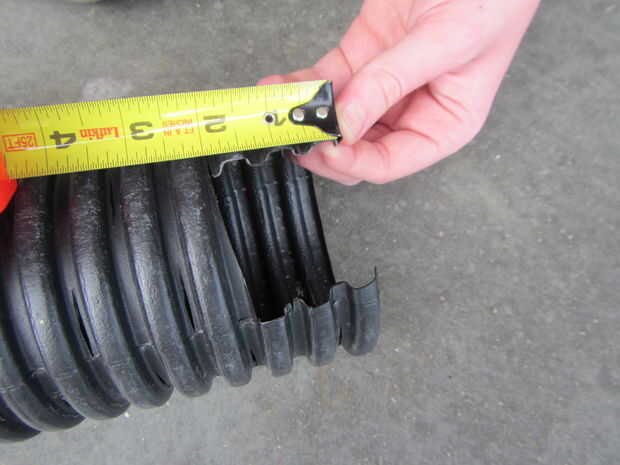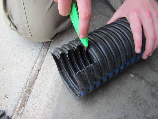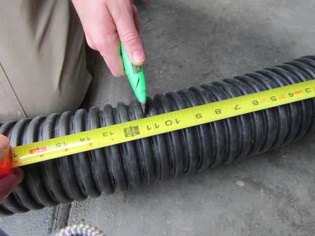 Cortar un trozo de azulejo de drenaje corrugada perforada de 4" para ajustar la longitud del contenedor.