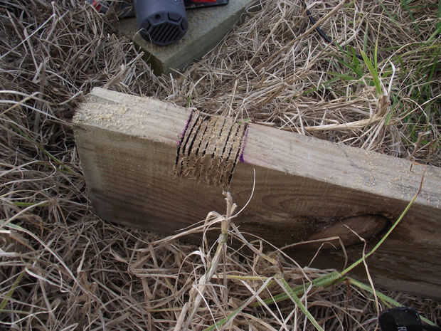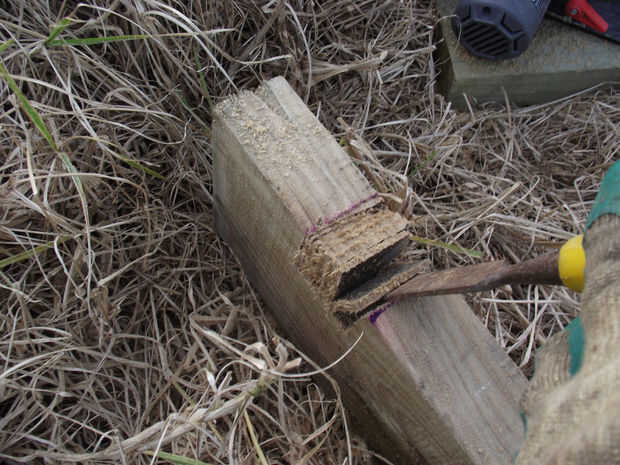 Luego hice varios cortes paralelos y retirar lo residuos ingenio un cincel, al finalizar la parte inferior de la ranura fue limpiada hacia fuera por movimiento oblicuo de la sierra circular (se puede utilizar un cincel pero herramientas eléctricas son más rápidas)