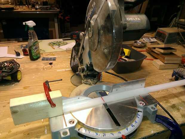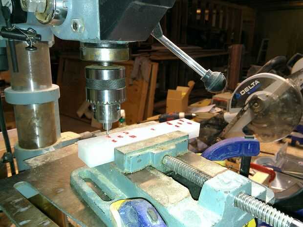 Por falta de un mejor término llamar la vertical soporta (que sandwich entre las piezas de armadura superior e inferior) los mamparos. Estos están hechos de 3/8"-thick-by-1-1/4"-wide barra de polietileno UHMW. Cada uno de 6-5/8" largo corté con una sierra de ingletes usando una parada para asegurar que ambas piezas son exactamente la misma longitud.
