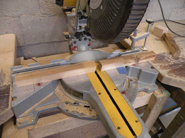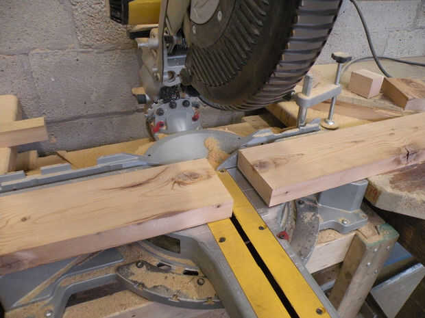 A continuación, corte los pies en dos secciones de 12". Cortar dos tramos de 2 "x 6" a 24". Vuelta el chop vio a 10oy corte dos opuestos ingletes en el 2 "x 8". El lado más corto de la pieza debe ser aproximadamente 14-1/4", que va a determinar hasta qué punto aparte el sentarse de piernas y la tensión de la bolsa se extendía.