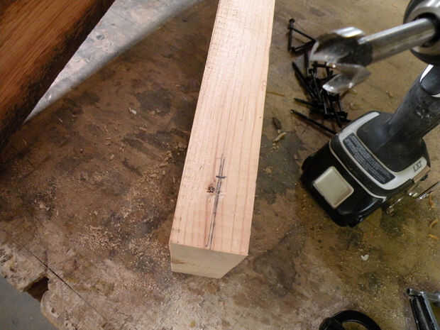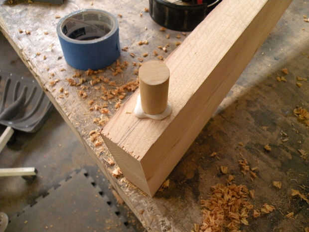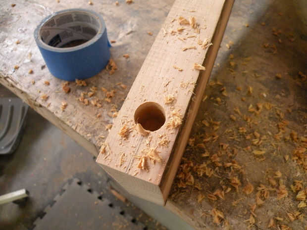 Medida 1-1/2" a cada lado y fregadero de un orificio de 1" a 3/4" bits. Pegamento en una clavija de 2".