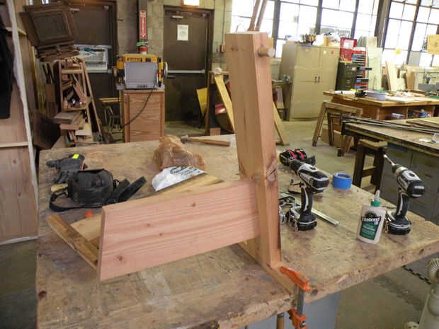 Abrazadera una pierna a una tabla por lo que está de pie. Unte pegamento en el travesaño, manténgalo en sus marcas con una mano y atorníllelo en su lugar con la otra mano. Repita para el otro lado. Asegúrese de que el travesaño no consigue torcido, ya hará que la roca de la cosa en sus pies.