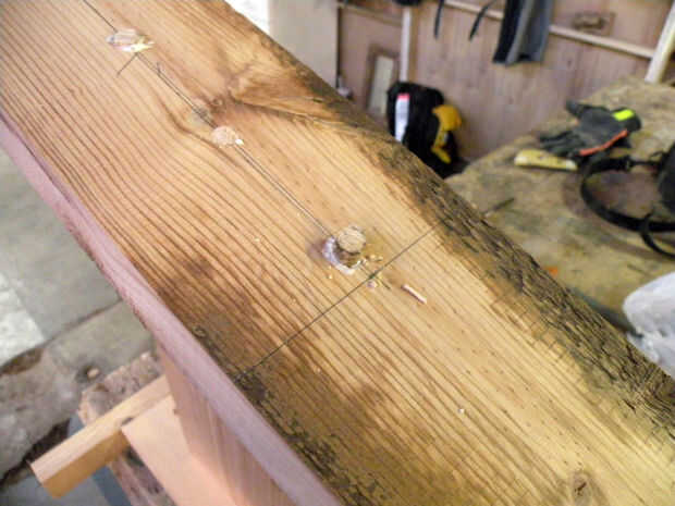 Otra línea central de la huelga el interior y exterior de cada pata. La parte superior del travesaño (el de 2 "x 8") deberá pegar la pata en alguna parte alrededor de 11 "hasta el interior de la pierna. Marca 11", luego use su plaza para envolver esa marca alrededor al exterior. Medida 7" abajo de eso y hacer otra marca. Espacio uniformemente tres perforaciones piloto en la que 7", utilizando un 1/8" para los tornillos y un 3/8 "broca para avellanarles.