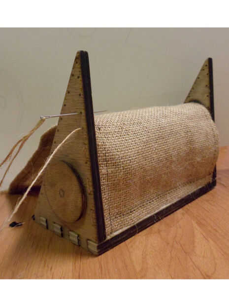 El siguiente paso es coser la tapa. se necesita taladrar agujeros alrededor del borde del marco. Les hice unos 10mm de separación. Entonces se toma la aguja y cose el hessian en la radio, usé un hilo de rosca del hessian para coser con pero cualquier cadena delgada tienes también debería funcionar.