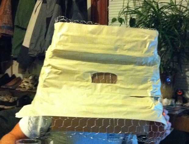 Para empezar encontré una caja lo suficientemente grande como para caber encima de mi cabeza y descansar sobre mis hombros.  Una caja funciona bien porque la forma básica de Carls cabeza es cuadrada.  Cubrí los lados y parte superior con alambre de pollo dejando un borde redondo para barbilla grande Carls.  Alambre de pollo funciona bien porque es fácil forma y molde además de su fuerte.  Luego cubrí todo en cinta de enmascarar porque el papel maché no se adhieren al alambre pero funciona bien con la cinta.  Deje un agujero para la nariz, orejas y una cresta en su rostro para las cejas.  Tenga cuidado cuando corte el alambre de pollo, los bordes afilados puede formar y puede pinchar te.