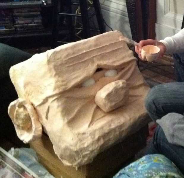 Papel maché fue seca en un día y medio.  También coloqué un ventilador de ventana en Carl para acelerar el tiempo de secado.  Luego, pinté la cabeza Carls con pintura acrílica.  Usé un color llamado "Santas carne" para la cara y el "Oro de cacao" para sus audífonos.  Usé esmalte de uñas azul de sus ojos y un marcador permanente negro para sus pupilas y la boca.