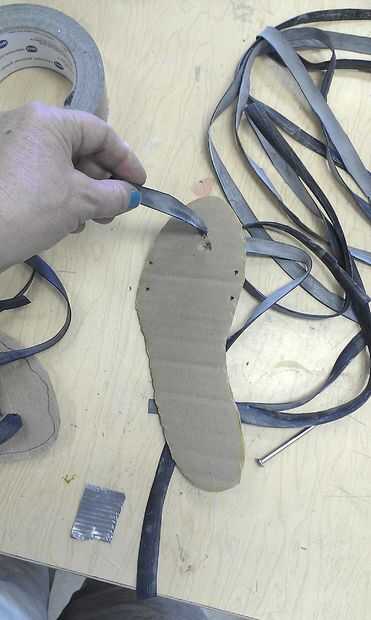 Punch 2 agujeros en el cartón, entre los dedos de los pies e hilo de rosca de la tubería a través de los agujeros, para que ambas partes salen de la parte superior, y tienes un bucle a través de la parte inferior. Poner su sandalia y agujeros en los lados donde quieras los cordones para apoyar el pie. La tubería a través del hilo de rosca y ajuste según sea necesario. Cuando se tiene un ajuste que te gusta, reforzar el cartón y el tubo con cinta aislante un poco. ¡ Disfrute!