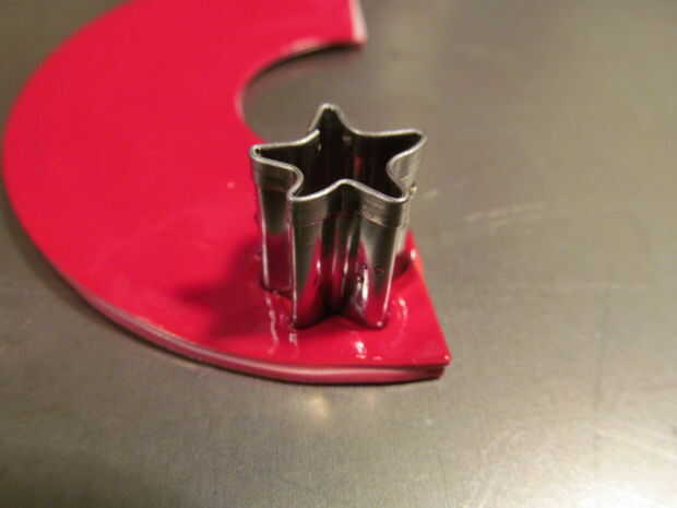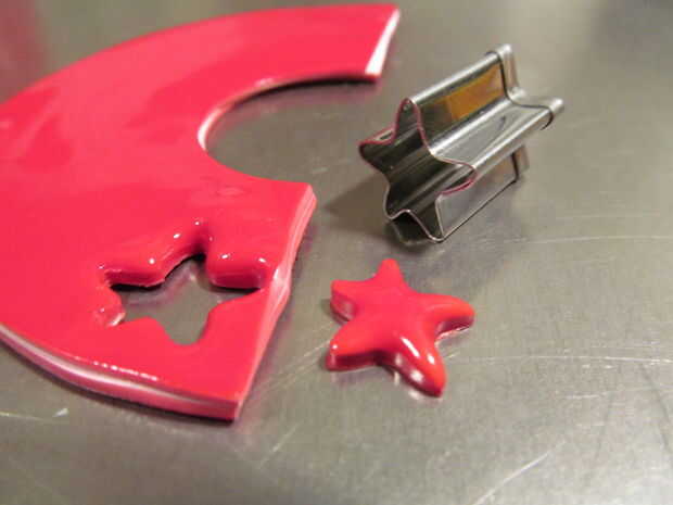 Mientras el plástico es todavía use un cortador de galletas para cortar tus pendientes. Los «cortadores de la galleta"que estoy usando se utilizan realmente para arcilla polimérica. Usted puede encontrar varias formas diferentes en la tienda de artesanía en la isla de arcilla de polímero.