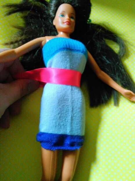 hice este vestido en mi clase de diseño de moda. ¡ Muy fácil!Todo lo que tenía que hacer era hacer un tubo básico vestido fuera de un cuadrado de 6 x 6 pulgadas de jersey azul matterial. [La mano cosida]Después de hacer este vestido de tubo, entonces
