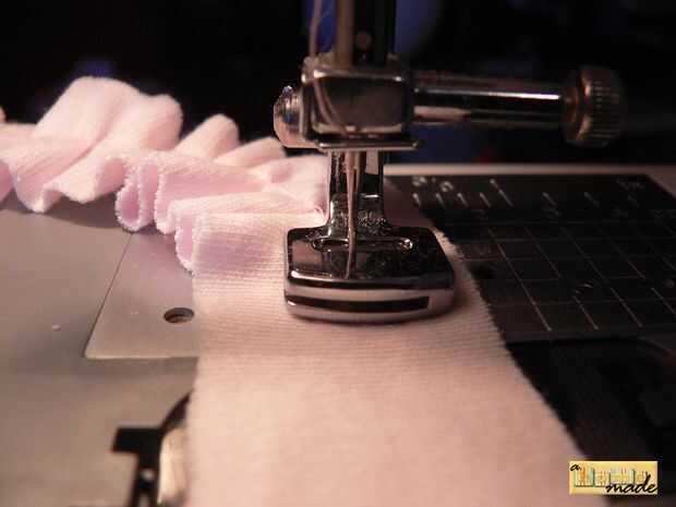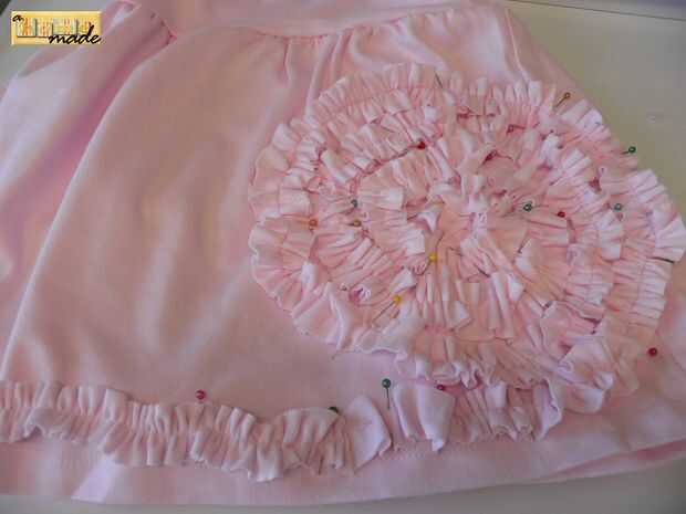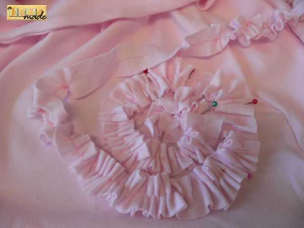 Luego prender los volantes a la falda en espiral para formar una flor grande. Comencé centro, justo encima de la media de la falda. Decidí tomar el volante todo el camino alrededor de la parte inferior de la falda. Puedes ver en la foto que tenía un hipo con mi pie de la baranda. No se preocupe, simplemente cortar el las piezas no rizado y traslapo donde parar y empezar. Incluso no notarán la rotura en volantes. :) Luego c a r e f u l l y (con el hilo normal de la bobina) Fije el volante a la falda.