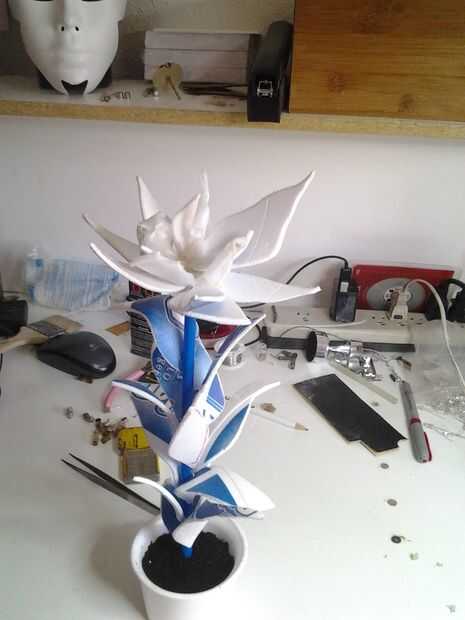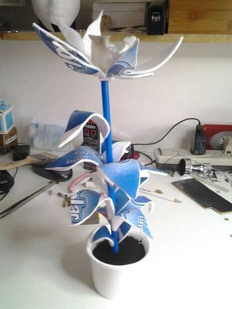 Después pegué todo juntos, tomé mi fuente de calor, que era mi soldador y agarró la punta de la hoja y ligeramente tirado hacia abajo como que utiliza el calor de la pistola en mi otra mano para calentar lentamente las hojas y flores para darles sus formas únicas. Esto es donde usted tiene que tener cuidado pero ser creativo. Nada de esto tiene que ser perfecta, cada flor tiene su forma única y su estilo. Divertirse con él.