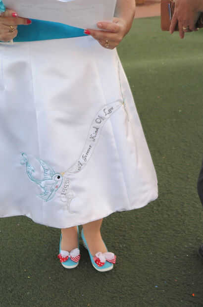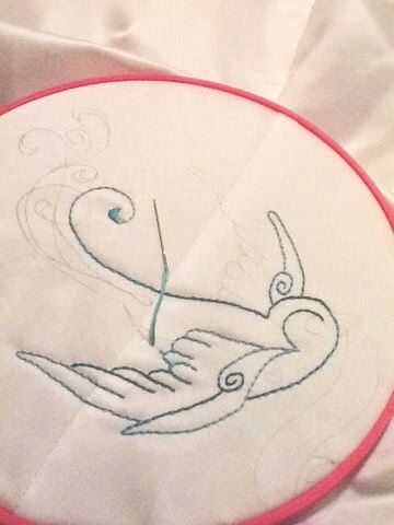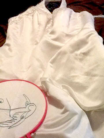 Quería personalizar este vestido como lo es para mi 20 aniversario, así que los pongo en algunos bordados a mano. Encontró la imagen de un ave de aspecto tattoo-ish en línea y tamaño con software de imágenes y luego imprime. Había colgado el vestido delante de una ventana (con eficacia utilizándolo como una caja de luz) y coloqué las imágenes impresas en el vestido y muy ligeramente había remontado los diseños con un lápiz. El siguiente paso es el bordado de la tela con un aro de bordado y empezar un bordado de línea muy simple. (hay 1 millón de tutoriales en línea que muestra cómo el bordado de la mano) Todo el diseño me llevó cerca de 2 semanas sólo trabajando en ello para alrededor de una hora en un tiempo después del trabajo. Estoy seguro de que otros son más rápidos que yo pero yo era un novato y quería tomar mi tiempo.