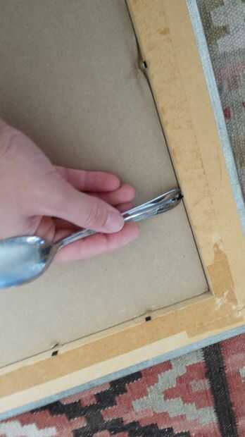 Desarmar el bastidor y deseche el cristal y el respaldo envolviendo en papel y cinta de seguridad. Utilicé la parte trasera de una cuchara para doblar los puntos de la estructura.
