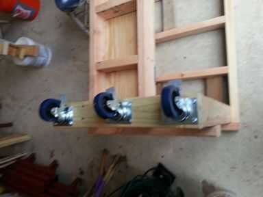 Esperemos que esto le permite ver el camino une las ruedas a las patas con los soportes transversales de 2 x 4. Las ruedas se fijan con tirafondos.