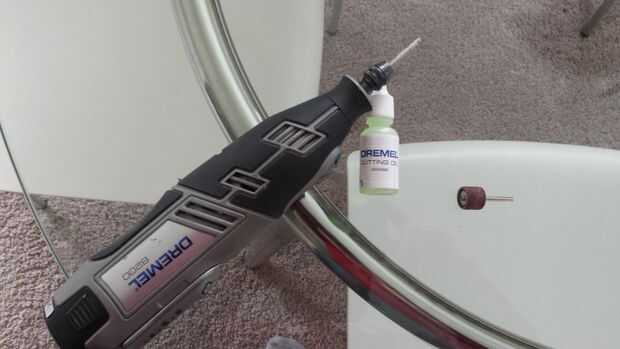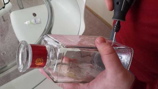El proceso de corte puede durar unos 5-10 minutos dependiendo de la herramienta rotatoria que se utiliza. Instale la broca de diamante y poner un par de gotas de fluido de corte y la ubicación de donde va a ser el agujero en la botella. Acelerar su herramienta a 15000 rpm y aplique una ligera presión a la botella. Se necesita detener y aplicar más fluido de corte en cualquier momento comienzas a ver polvo volar. El líquido ayuda a la cuchilla para cortar pero en este caso también ayuda a absorber el polvo de vidrio. Repita hasta que su orificio es completado.