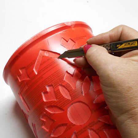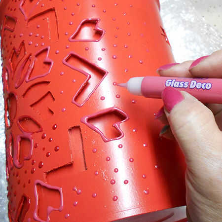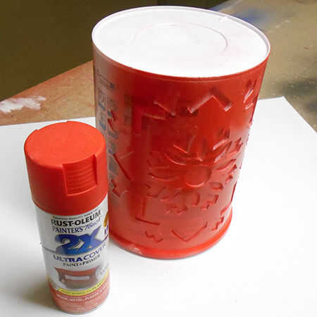 8. el exterior se ha rociado con un par de capas de Rust-Oleum 2 X satén rojo amapola. Todavía no contento con los bordes cortados, apliqué una capa delgada de Bostik vidrio deco (hinchada) la pintura.