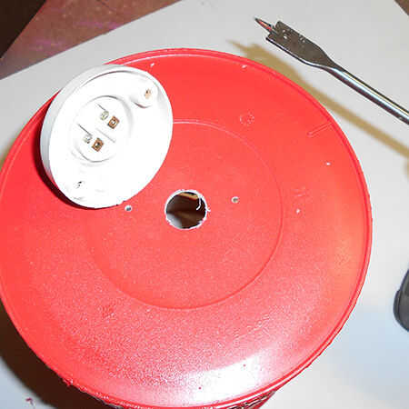 10. para montar el portalámparas taladré un agujero con un 16mm pala poco y dos agujeros de 2mm que empareja los agujeros en el sostenedor de la lámpara. El sostenedor de la lámpara se atornillarán en el interior del contenedor.