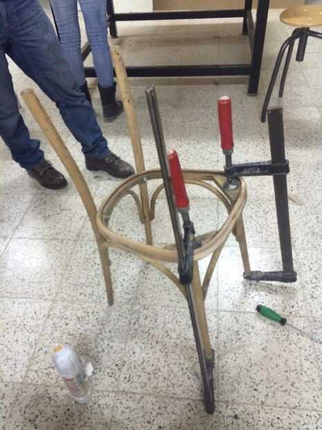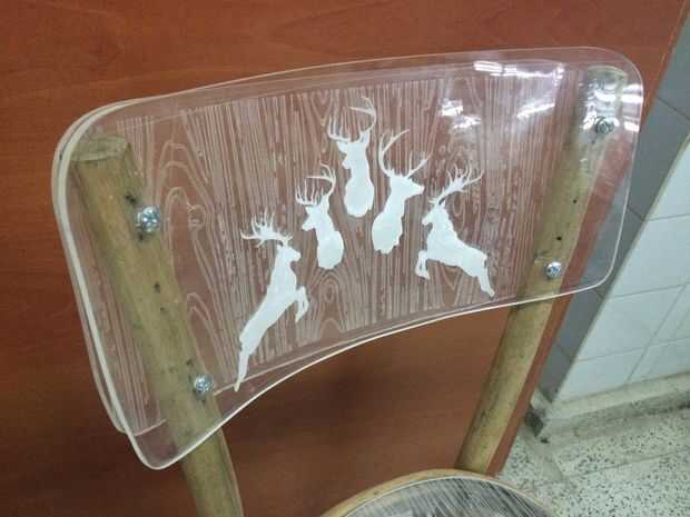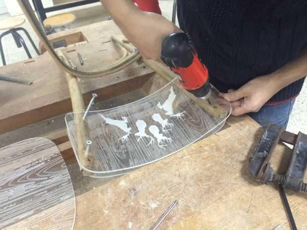 las partes de la silla de madera barnizada siendo merge con el plex. Usé un taladro y tornillos de combinación de piezas.