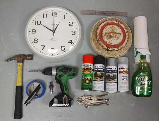 Se puede llegar con menos, pero esto es lo que usé para hacer estos relojes de tapacubos.