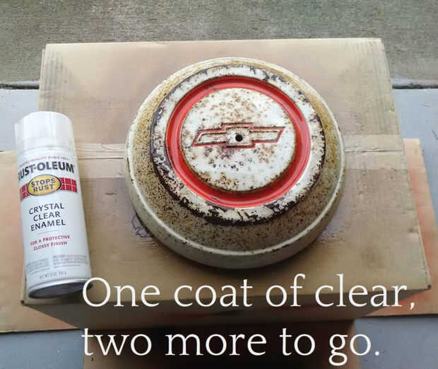 Hay un montón de opiniones sobre la mejor manera de preservar la "pátina" o acabados oxidados. Elegí el esmalte claro porque quería un acabado brillante que fue fácil de aplicar y haría bien en un ambiente de garaje y tienda.