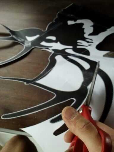 Una vez que la imagen está adherida al plástico, es hora de recortar la plantilla.  Utilice unas tijeras afiladas y lentamente ir!!!!!!  Asegúrese de cortar hacia fuera cualquier puntos (espacio negativo) que pueden ser rodeados por la imagen (espacio negro).  Tener paciencia e ir poco a poco.  Usted quiere que sea perfecto!