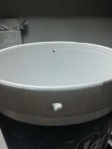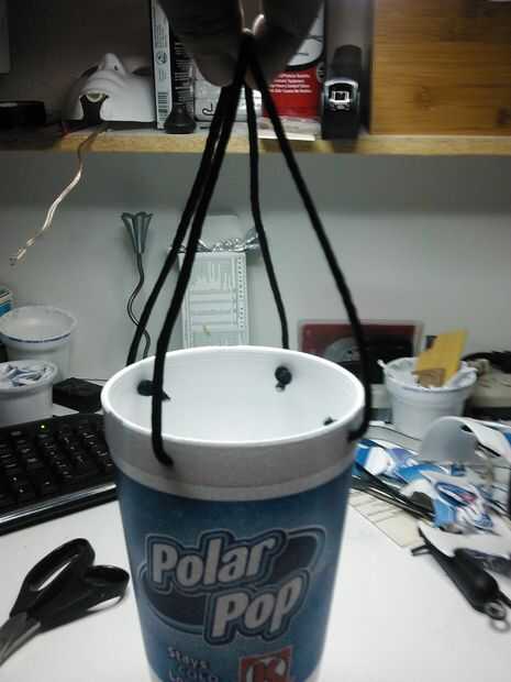 - Utilice las pinzas o algo para hacer 4 agujeros en la parte más superior de la Copa. Espaciados uniformemente, adyacentes entre sí. Los agujeros deben ser lo suficientemente grandes para lo que su uso para colgar la maceta.