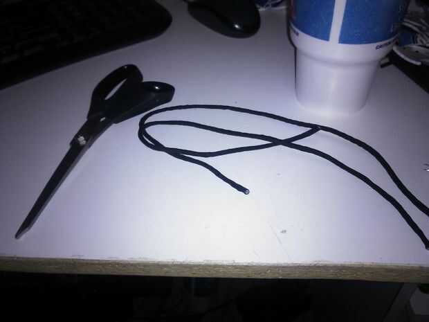 - Tome un extremo de lo que su uso para colgar. Utiliza paracord y cortar 14" de largo y había derretido en los extremos. Uno de los extremos del palillo a través del orificio y un nudo, luego poner el cable por el orificio adyacente y un nudo...