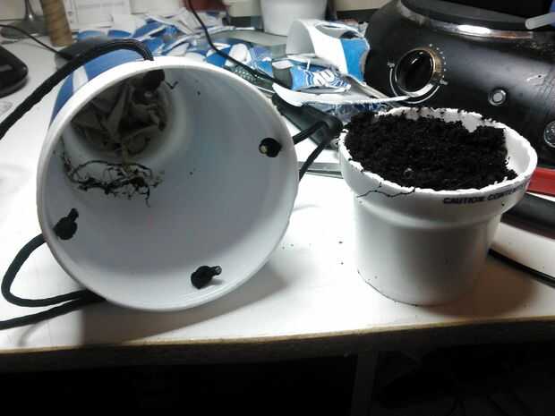 Luego añadí cuidadosamente la tierra en la taza. Después de tenía algunas semillas de cebolla verde y ponerlos en el suelo en la parte superior. De esta manera las judías verdes crecen hacia abajo, y las cebollas verdes crecen arriba... aprovechando el plantador. Este no era mi idea, pero no importa lo prestado. Gracias...
