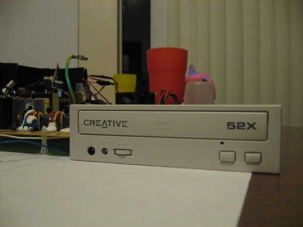 Tengo una sin usar CD-ROM con el juego de panel frontal y saltar botones de mi stock de equipo viejo. Desde que supe que iba a necesitar 12VDC y 5VDC para ejecutar, decidí desechar la fuente de alimentación pequeña que estaba en el boombox y sustituirla por una más robusta fuente de alimentación conmutada de nuestro DirecTV DVR, que no estaba siendo utilizado para nada, ya que robaron su disco duro para construir un equipo alrededor. :-) Yo también compactarse un fan de la DVR. Ver detalles sobre cómo funcionó encendido todo en el paso 7.
