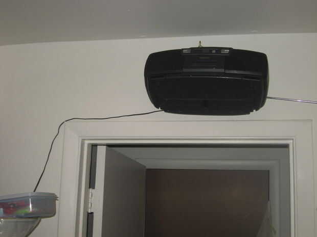 Yo sabía que quería comenzar con un boombox viejo que ya estaba en la cocina. Colgado sobre la puerta de entrada a nuestra despensa. La radio y el reproductor de cassette trabajan, pero no el reproductor de CD.