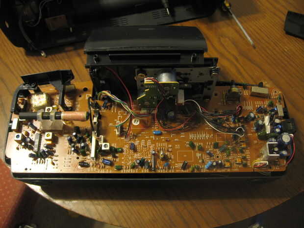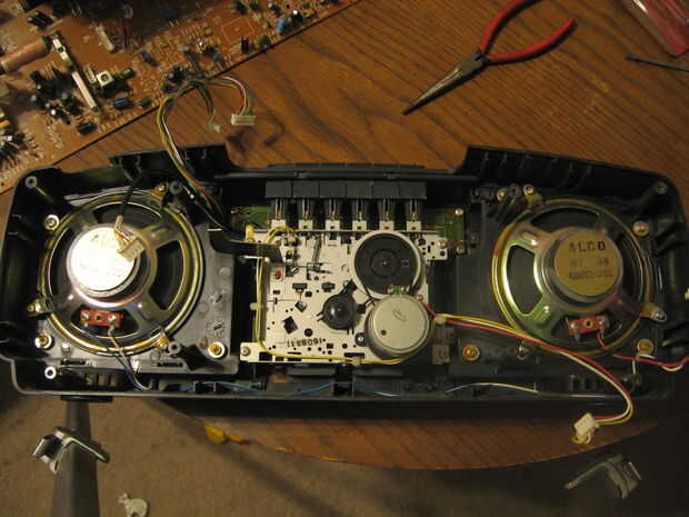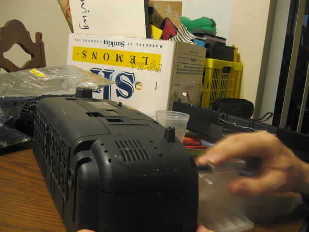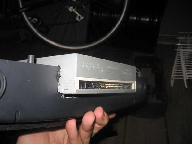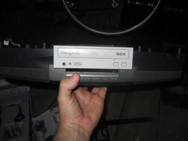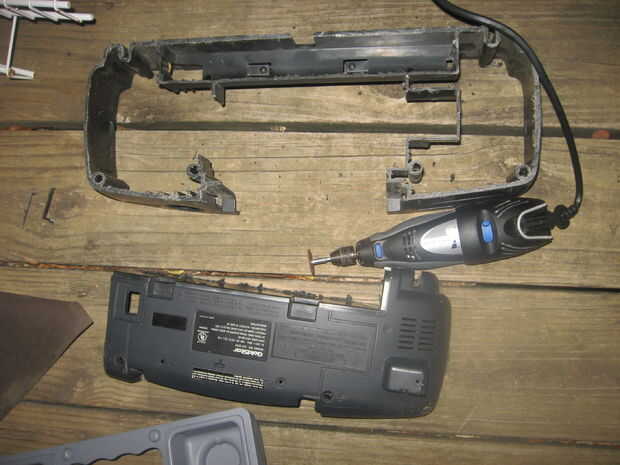 He marcado una línea alrededor de la parte posterior media y tomó la sierra para el corte áspero. Luego usé la Dremel para cortar a través de las piezas interiores de plástico hasta que la espalda todo (ahora la parte superior) estaba apagado. Yo entonces recortado hacia fuera el frente y atrás para que encajaría en el CD-ROM. Como yo había previsto, cabe bastante bien desde la parte delantera, con un vacío debajo que pensé que podría rellenar con otro material. Sin embargo, colgó a la espalda, y desde que supe que sería ser cableado encima de la parte posterior del CD-ROM, que significaría añadir algún tipo de recinto allí o tener alambres flotando en el lugar, ninguno de los cuales era atractiva.