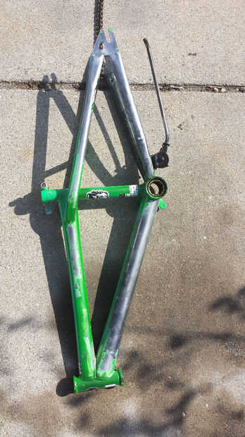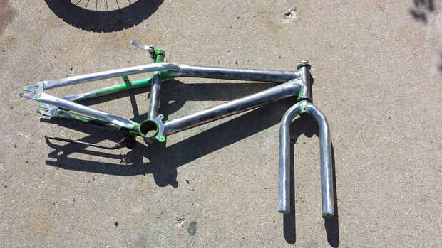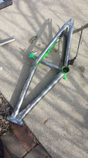 Para quitar la pintura simplemente conectado mi disco de cerdas de alambre y abrasivo a mi taladro y me fui a la ciudad para llegar a cada rincón. Puesto que esto era una bicicleta de tamaño juvenil llegó con un montón de etiquetas y pintura gruesa para quitar. Esta es la parte más laboriosa del proyecto, pero una vez que la pintura y el óxido está apagado y ver el brillante marco del metal es merece la pena, sin dejar de mencionar que estará listo para dar a tu moto una capa fresca de pintura.