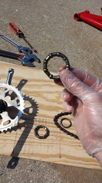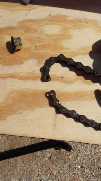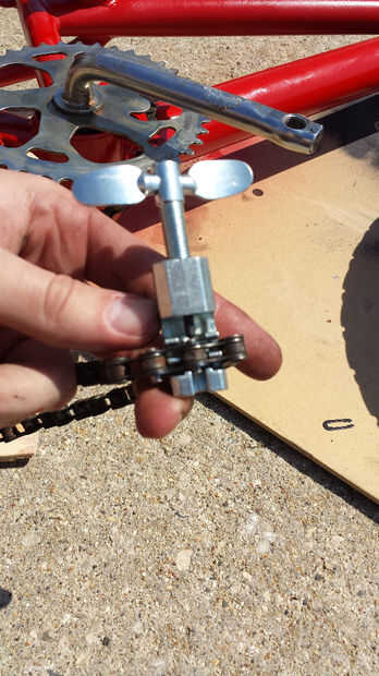 Volviendo a la cadena es difícil, el impulso para mí era el perno del martillo en los dos enlaces para completar la cadena pero esto debe evitarse ya que aplana los dos extremos del perno. En su lugar utilicé mi herramienta cadena bici (después de varios intentos) empuje el pasador del lugar.