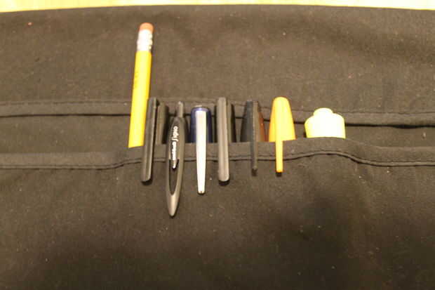 Ahora te quieren planificar cómo desea hacer su rollo, cómo va a cerrar, y pluma cuantas ranuras te quieren poner en. Doblar a la tela hasta hacer un colgajo que más tarde formarán las ranuras para los corrales. Asegúrese de que la tapa es lo suficientemente alta como para permitir cualquier plumas que tienes que ser capaz de agarrar a él, pero no tan alta te cubre algo o mantener las cosas de ir todo el camino. una aleta superior es opcional y podría ayudar a mantener las cosas de salir. Te recomiendo que hacer las ranuras de la pluma 2cm de ancho y agregar que unos 4cm de ancho rodillos de los marcadores, extrañamente en forma de plumas, etc.. Debo señalar que tenía algunos problemas en corrales con los apretones en los 2cm ranuras aunque eran escasas, así que ten esto en cuenta. Para finalizar, decidir donde quieres el hardware para ir y cómo usted a cerrar.