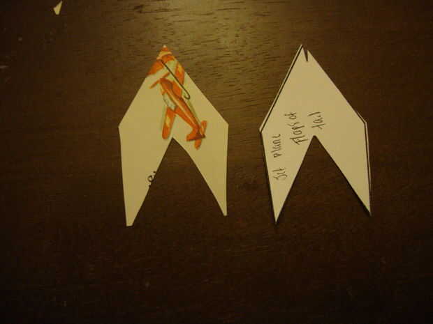 Dos patrones forman la cola del avión, cortar ambas piezas en su papel.  La aleta de llanuras necesita ranuras corte en ella para que la aleta de la cola puede caber a través de él.
