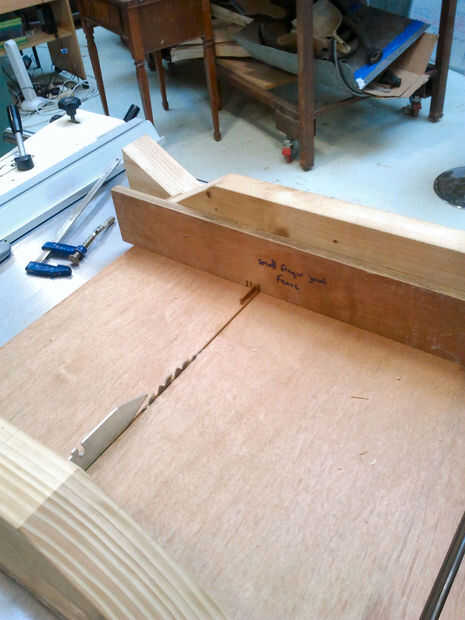 Para hacer el dedo juntas acababa de usar la 3.2mm ancho hoja de sierra (no un disco de moldurar ancho) y una plantilla casera. Vea aquí un tutorial de empalme Hanon: http://www.shopnotes.com/files/issues/110/fast-and-easy-finger-joints.pdf como se pasa el corte de 3,2 mm es aproximadamente el mismo ancho que una sola capa en la capa, que da un patrón interesante cuando la caja está montada.