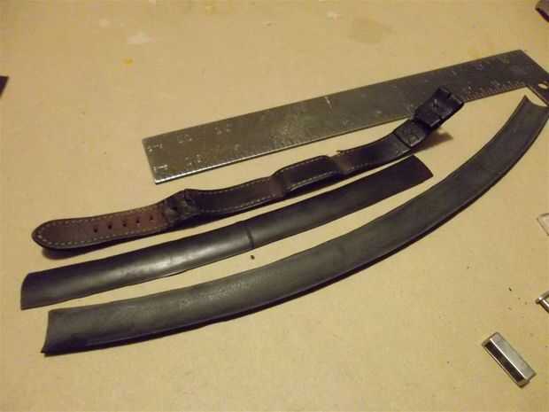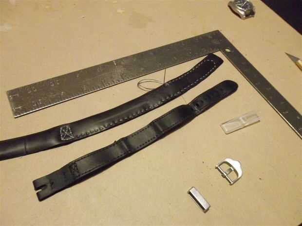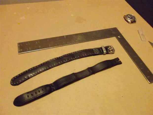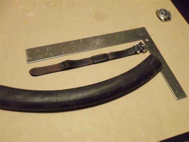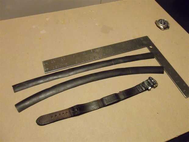 Cuando estuve cortando el material para la nueva banda de reloj, sólo puso una vieja a su lado y había utilizado como referencia. Hubo algunas líneas sobre el tubo interno, estoy presumiendo de fabricación, y proporcionaban una guía bastante buena para donde cortar longitudinalmente, aunque terminó encima de dar la banda terminada una leve curva. No es realmente notable cuando la llevo, pero si su algo que le angustia al portador, sería bueno que la pongo y corte recto con una regla.