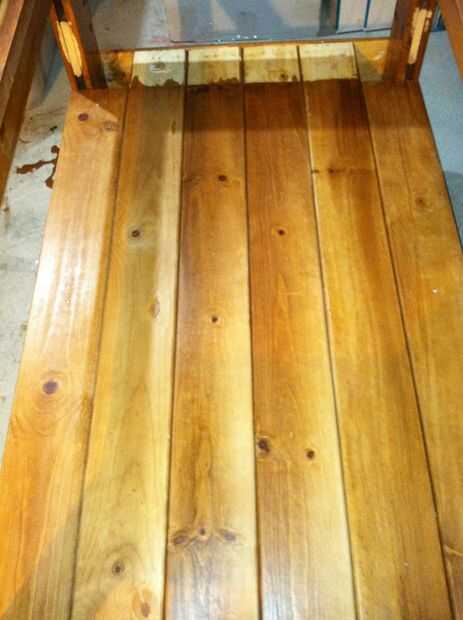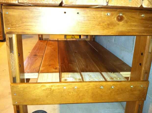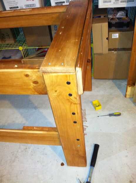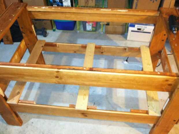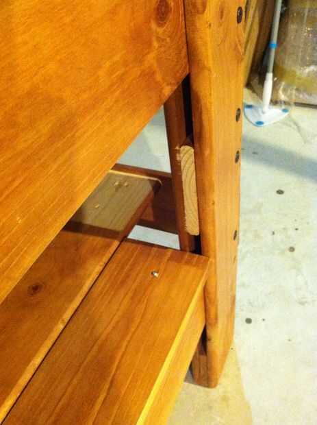 5. Añadir mediados peldaños de listones de la cama con tornillos para madera. No atornille de las tablas del estante del medio, ya fueron ajustados y me gusta poder acceder por debajo del Banco.