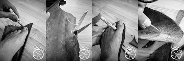 Al trazado, asegúrese de que la banda de rodadura del neumático está centrada debajo de los pies. Corte alrededor de la localización. Utilizar el rotulador para dibujar el orificio de ubicación entre los dedos y en el centro de la sección de la pared lateral debajo de la cresta con cuentas. Poke agujeros con una perforadora de cuero, tijeras, mano izquierda (si es un gancho porque eres un pirata), o algo fuerte.