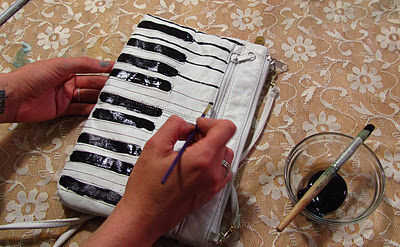 Ahora, con el pincel delgado, traza sobre las líneas entre y debajo de las teclas. Pueden hacer esta línea como pesado o tan fina como usted quiere. Míos son un poco saltones, realmente coincide con la sensación todo azarosa de la bolsa. Déjelo secar, preferiblemente durante la noche, antes de utilizar la bolsa. No es necesario sellarlo con cualquier cosa - eres bueno solo para salir en estilo!